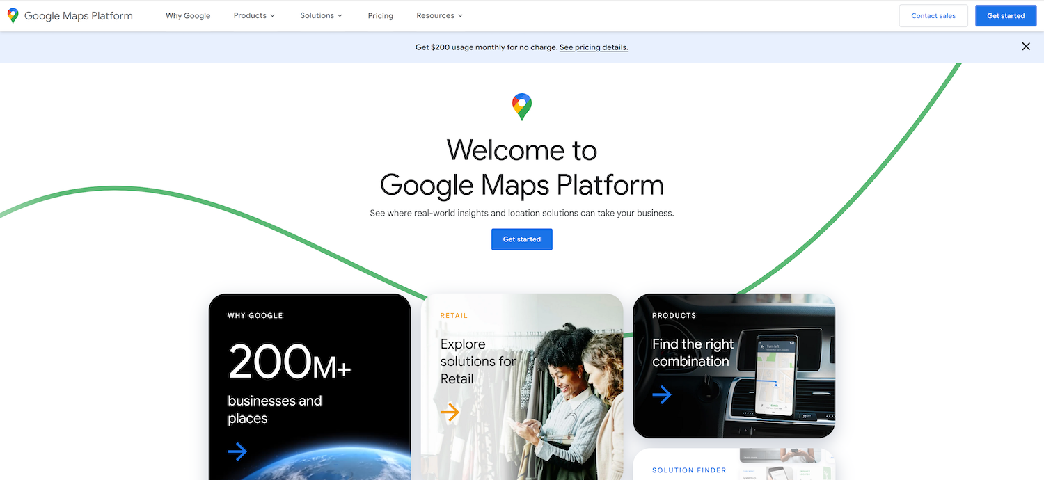 * Select [**Get Started**](https://console.cloud.google.com/google/maps-apis/start)**.**