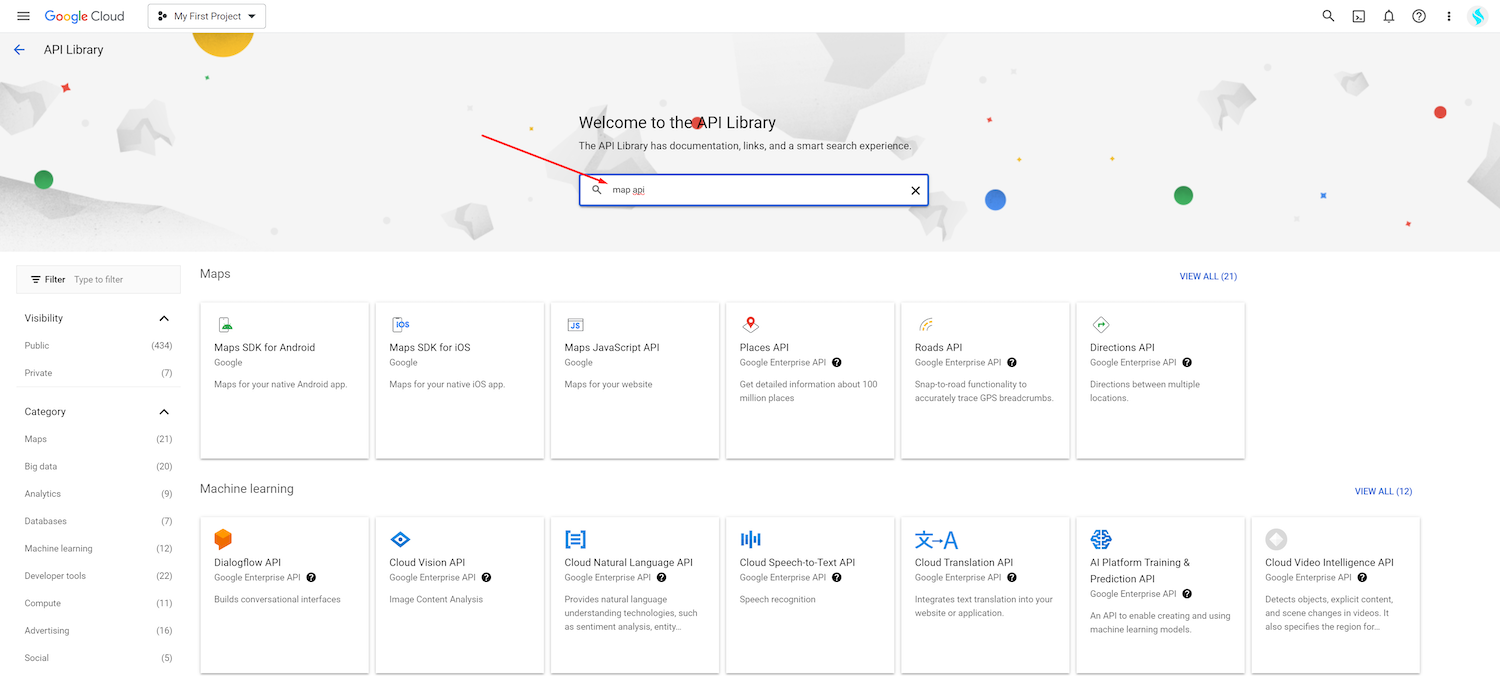 * Go to **API & Services** > **Library** and choose **Maps** category