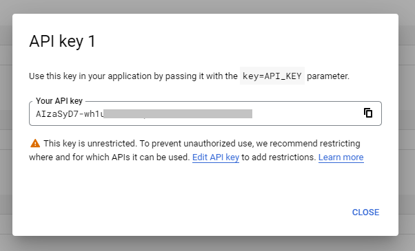 * Add this API Key to the app, under **Your Google API Key**