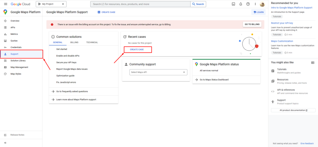 Or you can go to this tab directly by the link: [**https://console.cloud.google.com/google/maps-apis/support**](https://console.cloud.google.com/google/maps-apis/support)